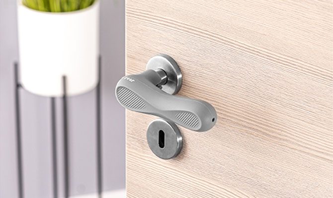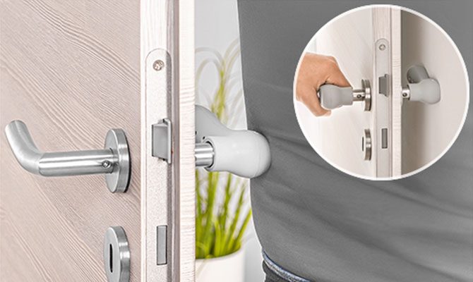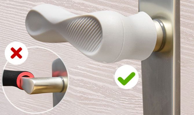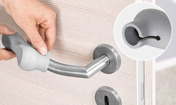 Vienkārši uzvelciet pārvalku uz durvju roktura – elastīgā materiāla dēļ tas der arī liektiem rokturiem.