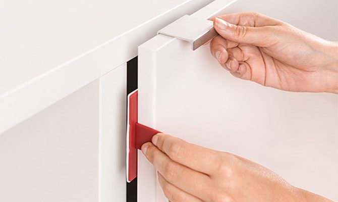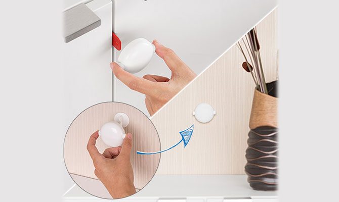 Slēdzene tiek stiprināta skapīša iekšpusē, tādējādi mēbeles ārējās virsmas paliek nebojātas. Pateicoties speciāli izstrādātai līmlentei, slēdzene paliek stingri vietā, bet nepieciešamības gadījumā to var nenoņemot atstāt bez pēdām.