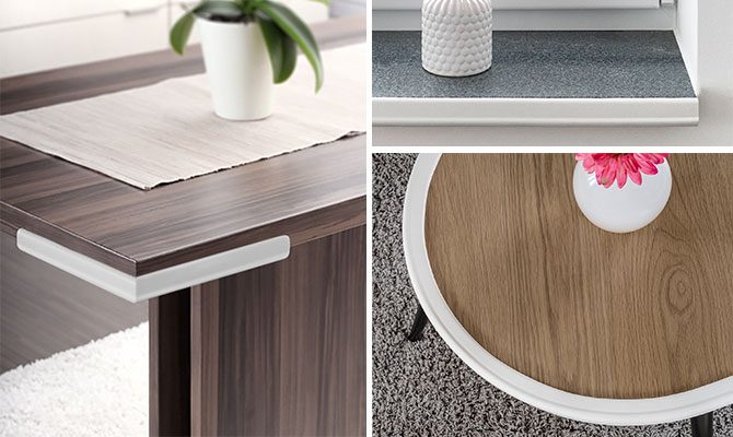 Piemērots dažādām virsmām: galdu, skapju, kumožu un palodžu malām. Var izmantot arī uz apaļiem galdiem. Pilnvērtīgai aizsardzībai maliņu aizsargu var uzstādīt gan uz augšējās, gan apakšējās malas.