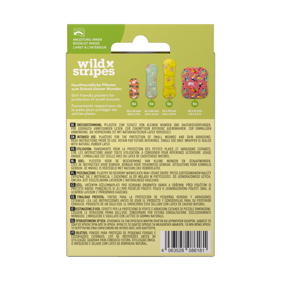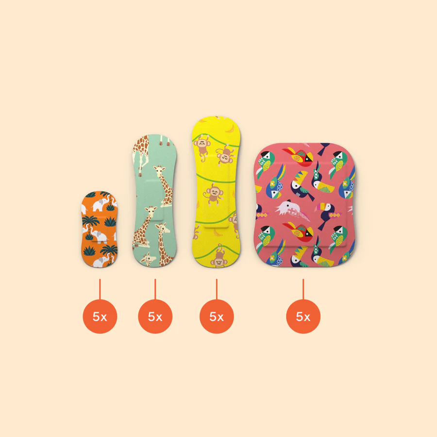 Unikālie, jautrie džungļu tematikas plāksteru dizaini – zilonis, žirafe, mērkaķis un krāsaini putni – piedāvā ne tikai aizsardzību, bet arī prieku bērnam jebkurā situācijā. Pateicoties patentētajai formai un mīkstajam, elastīgajam tekstila materiālam, plāksteri ērti pielāgojas mazām ķermeņa vietām.