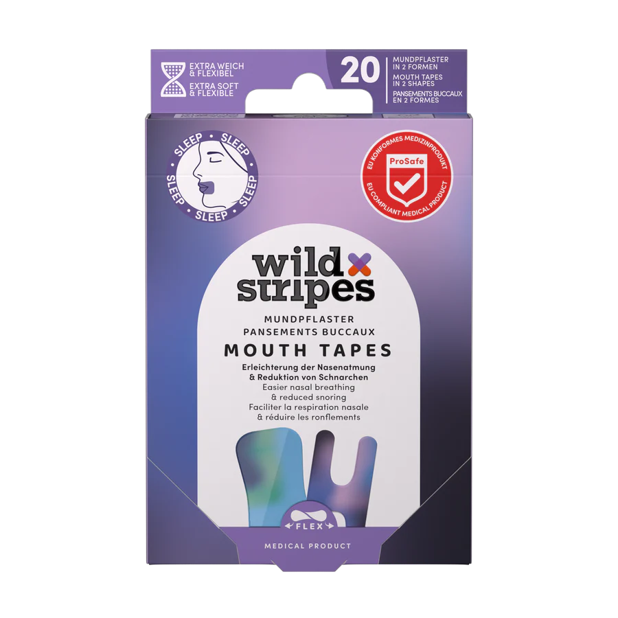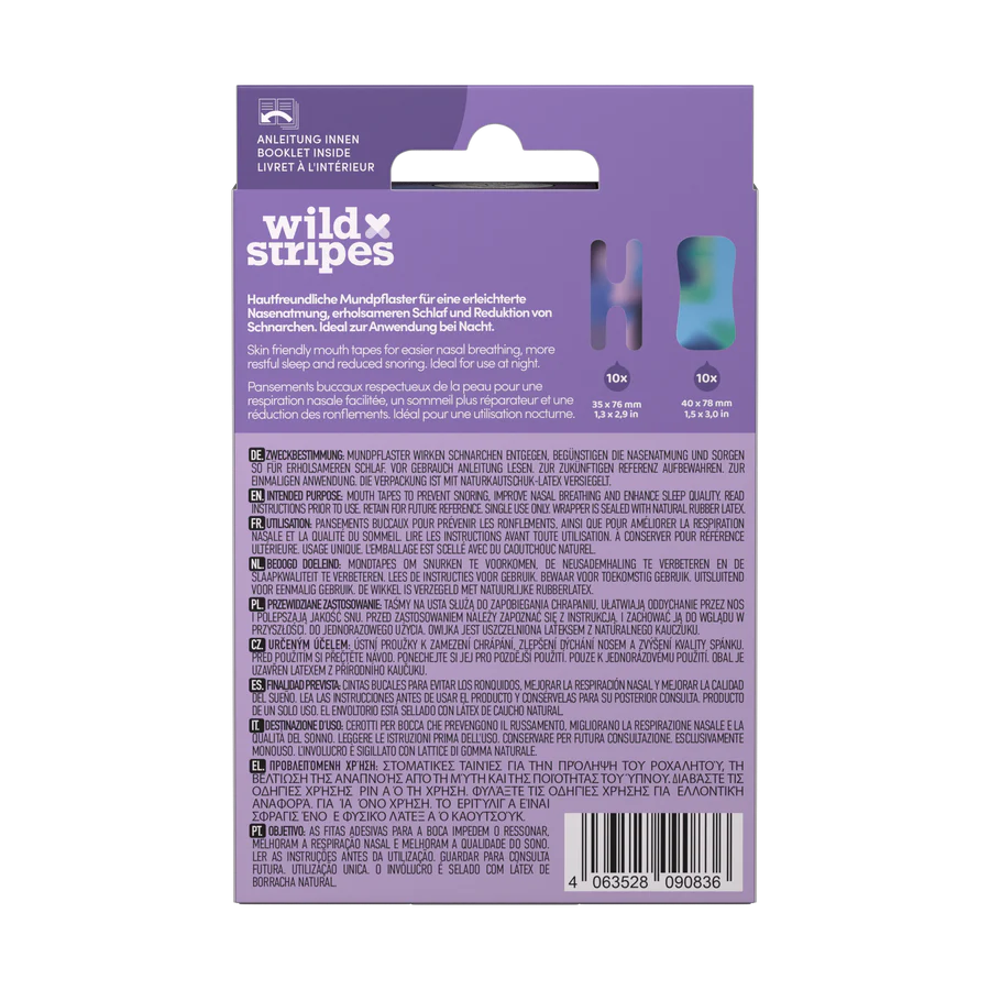 Wild Stripes® Sunset mutes plāksteris ir izstrādāts, lai palīdzētu jums sasniegt dziļāku un atjaunojošāku miegu. Šie ādu saudzējošie plāksteri veicina deguna elpošanu un palīdz samazināt mutes elpošanu un saistīto krākšanu. Rezultāts ir mierīgāka nakts un enerģiskāka pamošanās.