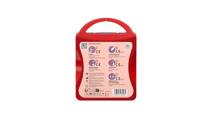Komplekts ietver daudzfunkcionālus piederumus nelielu ievainojumu ātrai un efektīvai apstrādei – dažādu izmēru plāksterus, apdegumu kompreses, tīrīšanas salvetes, elastīgo saiti un sausus tamponus. Visas sastāvdaļas ir kārtīgi iepakotas atkārtoti aizveramā kastē, kas lieliski iekļaujas gan koferī, gan mugursomā.