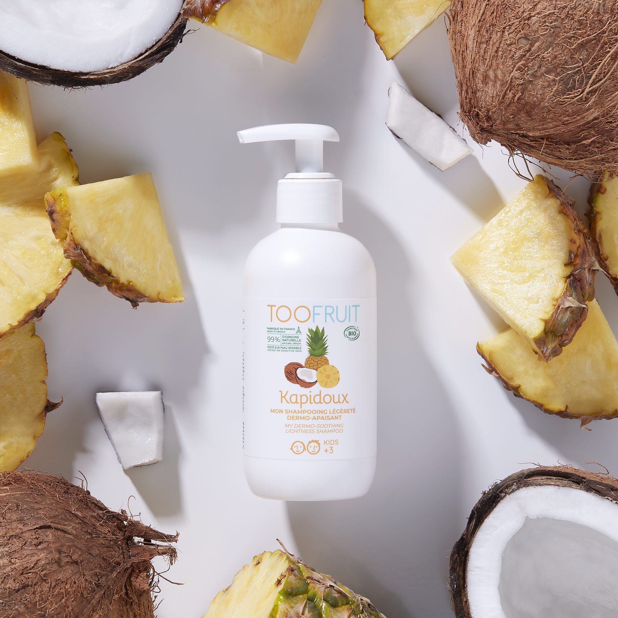 Kapidoux kokosriekstu-ananasu šampūnā esošie virsmaktīvās vielas maigi attīra matus un galvas ādu, vienlaikus lieliski likvidējot visus netīrumus, nenoslogojot bērna jutīgo galvas ādu. Glicerīns veicina galvas ādas mitrināšanu, bet jogurta pulveris atvieglo matu kopšanu un ķemmēšanu. Visbeidzot alvejas ekstrakts nomierina galvas ādu, bet saldo mandeļu ekstrakts dabiski aizsargā un mitrina matus. Kapidoux šampūns ir bagātināts ar bioloģisko saldo mandeļu eļļu, bioloģisko šī sviestu, bioloģisko ābolu ūdeni, bioloģisko alveju un arginīnu, lai pat visausākie mati iegūtu zīdaini gludu noslēgumu!